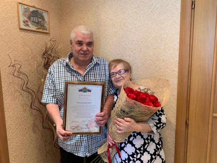 С юбилеем семейную пару поздравили сотрудники городского управления ЗАГС, им передали поздравительный адрес главы региона Владислава Шапши.