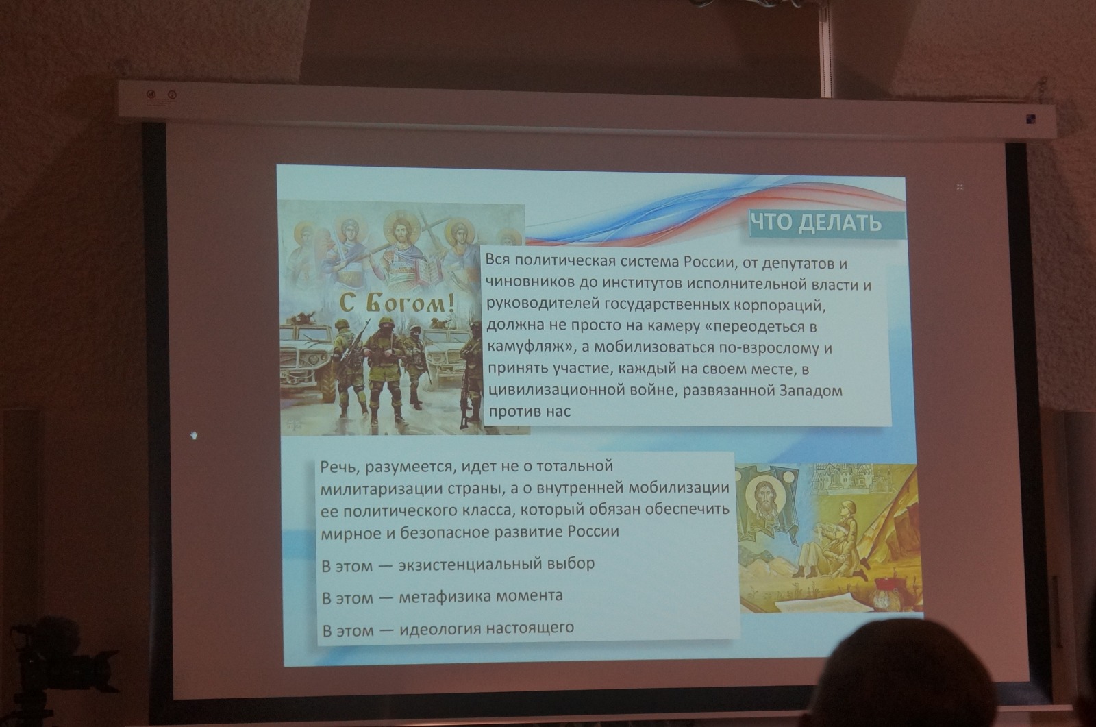 Основным докладчиком выступил советник министра обороны РФ Андрей Ильницкий. Подробную тематическую презентацию он сопроводил лекцией о целях и методах борьбы западных недружественных государств за умы наших сограждан и союзников.