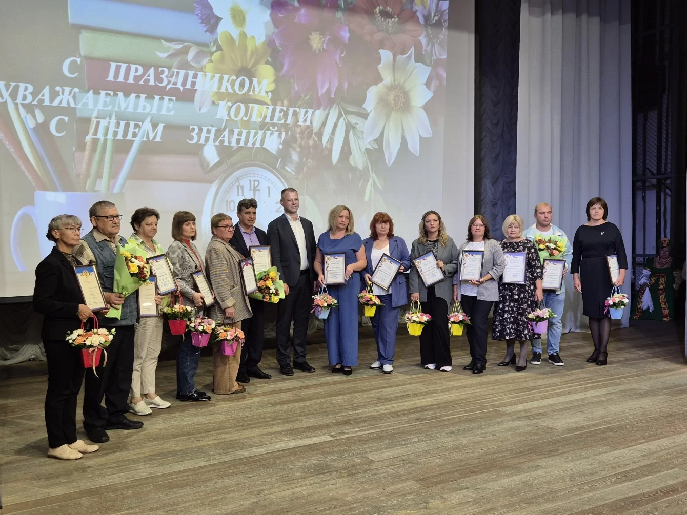На сцене чествовали лучших работников педагогического состава района. А в перерывах с награждениями на сцене выступали местные группы артисты.