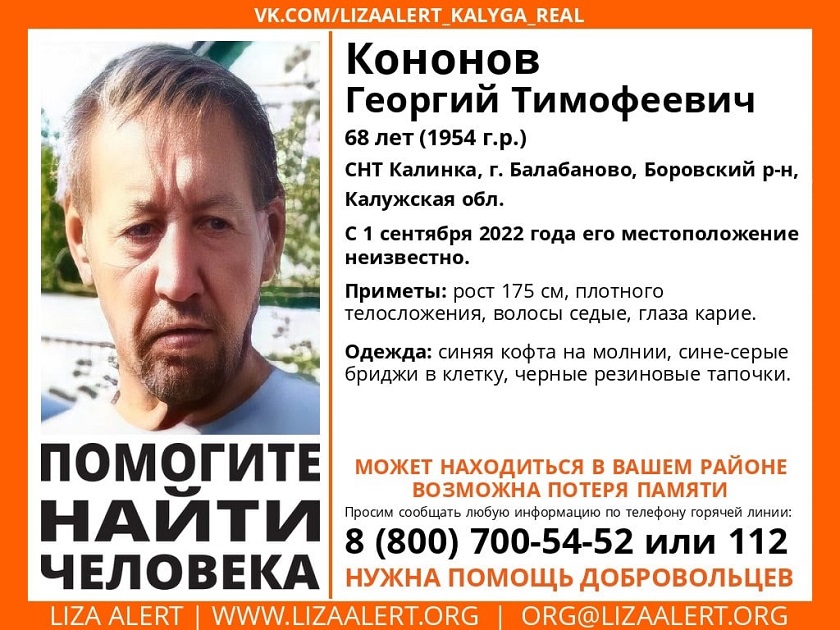 68-летний Георгий Кононов пропал накануне, 1 сентября. С тех пор его местонахождение никому не известно. Мужчина проживает в СНТ «Калинка» Боровского района.
