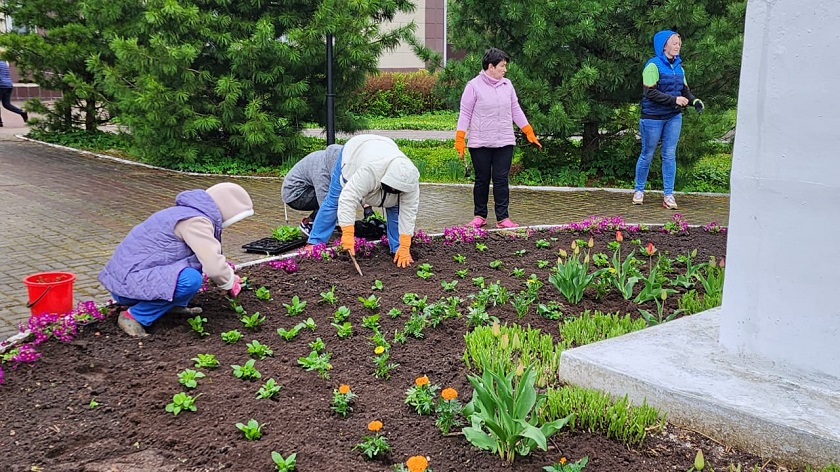 Несмотря на пасмурную погоду и моросящий дождь, субботник состоялся и прошел под девизом «Вместе сделаем поселок краше». На прилегающей к администрации территории расположено несколько боковых клумб и одна центральная. У входа стоят вазоны. Ежегодно сотрудники приводят в порядок и украшают эти места.
