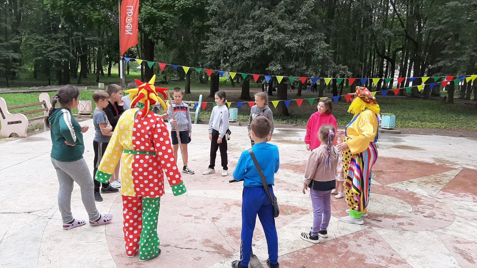 Артисты провели игровую программу «Встреча с Клёпой и Стёпой». Ребята вместе с клоунами представили себя конструкторами-испытателями, сделав самолетики и запустив их в дальний полёт. Дети разгадывали загадки и шарады от Клёпы и Стёпы. Весело плясали под музыку флешмоба «Пчелы» и «Путешествие».