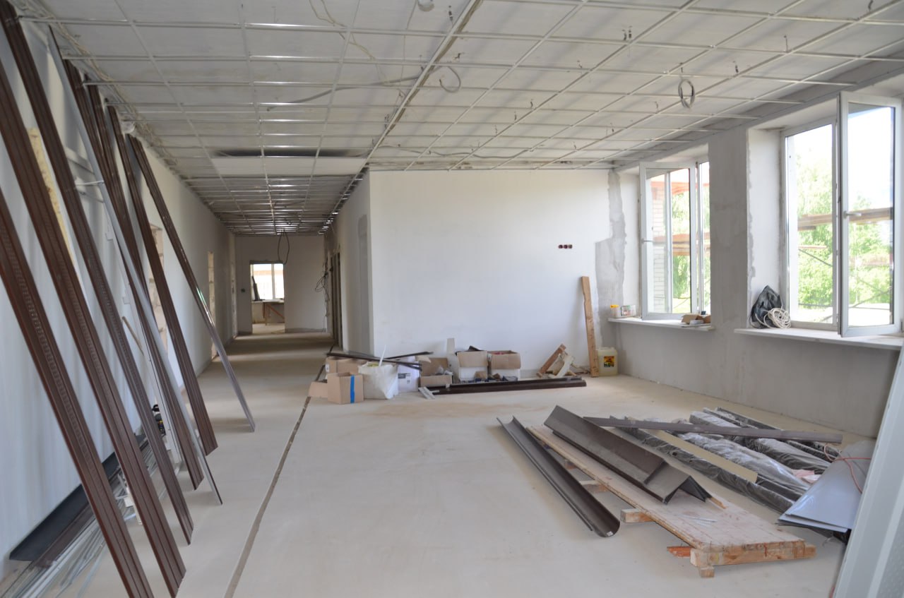 Внутри учебного учреждения отделочные работы еще в разгаре, но уже невооруженным глазом заметны перемены. В помещениях демонтированы полы и залито основание под новое покрытие. В процессе работ – выравнивание стен под последующее окрашивание.