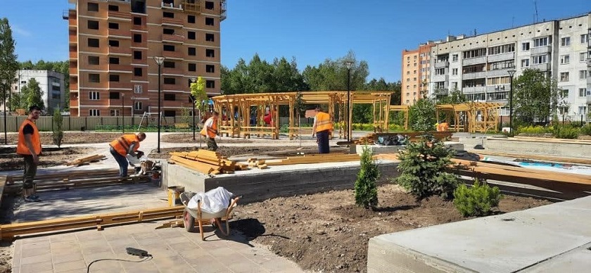 «Смонтированы каркасы циркульных навесов, остались важные финишные детали, в том числе покрытие сотовым поликарбонатом. Завезён материал деревянной облицовки бетонного основания парклета. Подготовлены детали для монтажа на нём пергол», - рассказал архитектор.