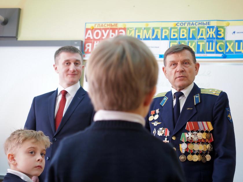 Рассказывая о важности военных профессий, Анатолий Исаченко признался, что с третьего класса мечтал стать военным летчиком и воплотил свое стремление в жизнь. Он подарил классу книгу «Боевые летчики – дважды и трижды герои Советского Союза». Андрей Акулин рассказал об истории праздника, подчеркнув значимость шествия «Бессмертный полк России», которое проводится 9 мая.