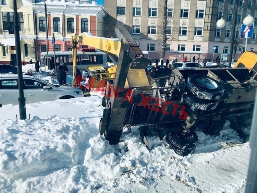 По фотографиям с места событий видно, что автомобиль с подъемником лежит на боку. Предположительно снег, на который выставили опоры автомобиля, не выдержал и провалился, в следствии чего машина и перевернулась.