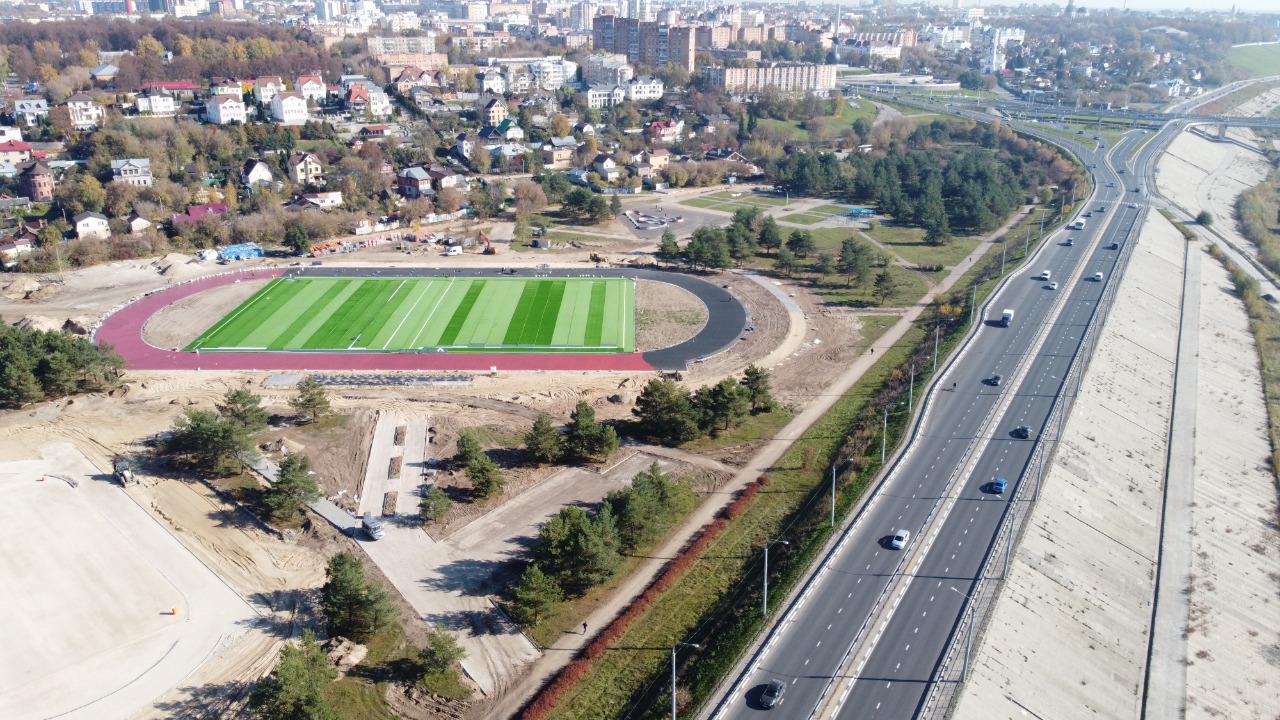 Здесь организуется физкультурно-оздоровительный комплекс открытого типа (ФОКОТ). Работы по устройству объекта выполняются по заказу управления капитального строительства города Калуги генеральным подрядчиком ООО «Сваймастер» с 7 июля. За это время выполнена вертикальная планировка, проведено устройство сети дождевой канализации, сделаны основания под искусственное покрытие футбольного поля и беговых дорожек. В целом на сегодняшний день физическая готовность объекта составляет почти 50 %.