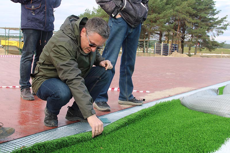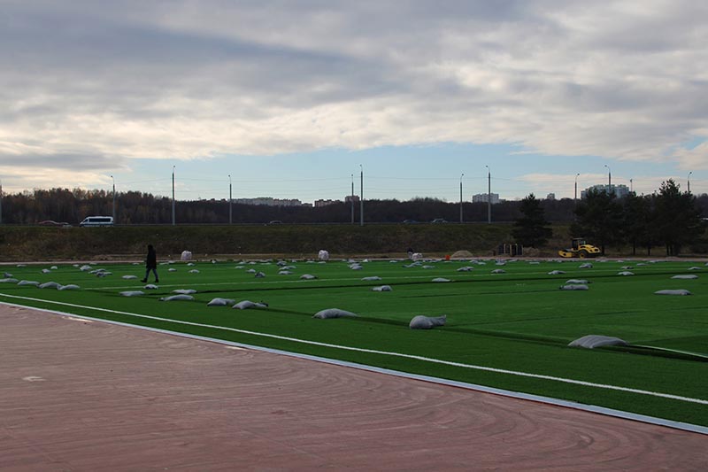 Уже установлено щебёночное основание физкультурно-оздоровительного комплекса открытого типа. Завершено устройство основания под искусственное покрытие футбольного поля и беговых дорожек. Рабочие приступили к прокладке электросетей и сетей канализации. Параллельно с этим строители обустраивают пешеходные дорожки, устанавливают фундаменты под опоры освещения поля, готовят основания под трибуны, рассчитанные на 400 болельщиков.