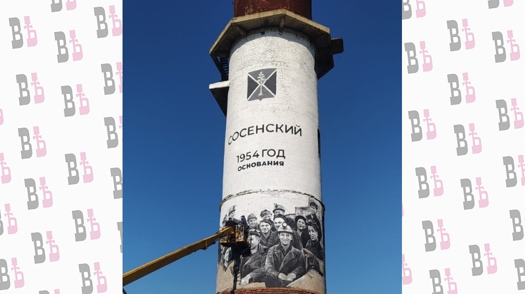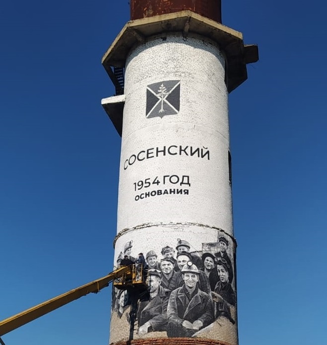 В концепцию пространства вписалась и преображенная водонапорная башня - на сооружении появился мурал, изображающий шахтеров, герб и год основания города.