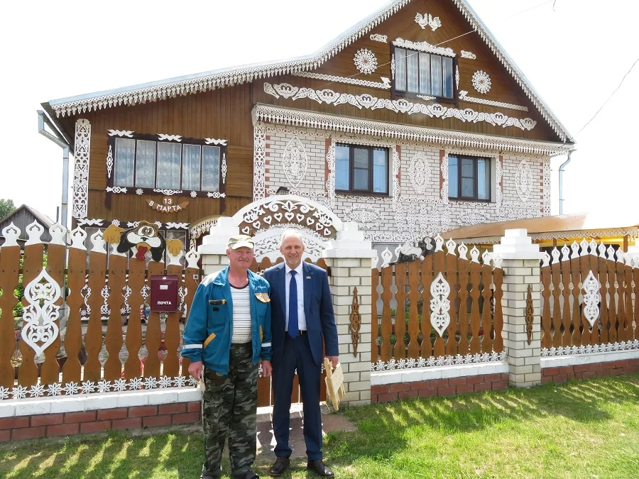 Распрощавшись с юбиляршей, Андрей Литвинов не смог не зайти в дом супругов Ворожеевых, который стоит посреди улицы словно сказочный терем. Здесь каждая дощечка домашнего забора украшена искусно выпиленной ромашкой, а по стенам самого дома идут веточки с цветами и плывут по ажурным волнам золотые рыбки, целуются голубки. Радуют прохожих резные наличники и всевозможные декоративные элементы. Хозяин Юрий Сергеевич сделал его таким своими руками, а еще мастер-самоучка изготавливает превосходную мебель из дерева: столы, стулья, табуретки, кресла и многое другое.