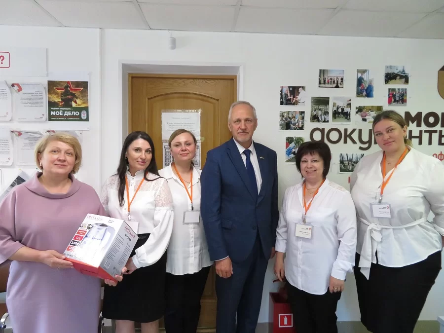 — сказал парламентарий.Следующим пунктом посещения стал многофункциональный центр «Мои Документы», который отметил свое десятилетие с момента образования. Андрей Альбертович поздравил работников МФЦ с праздником, отметив их высочайший профессионализм, преданность делу и вручил директору организации Наталье Борисовой памятный подарок – электрический чайник.
