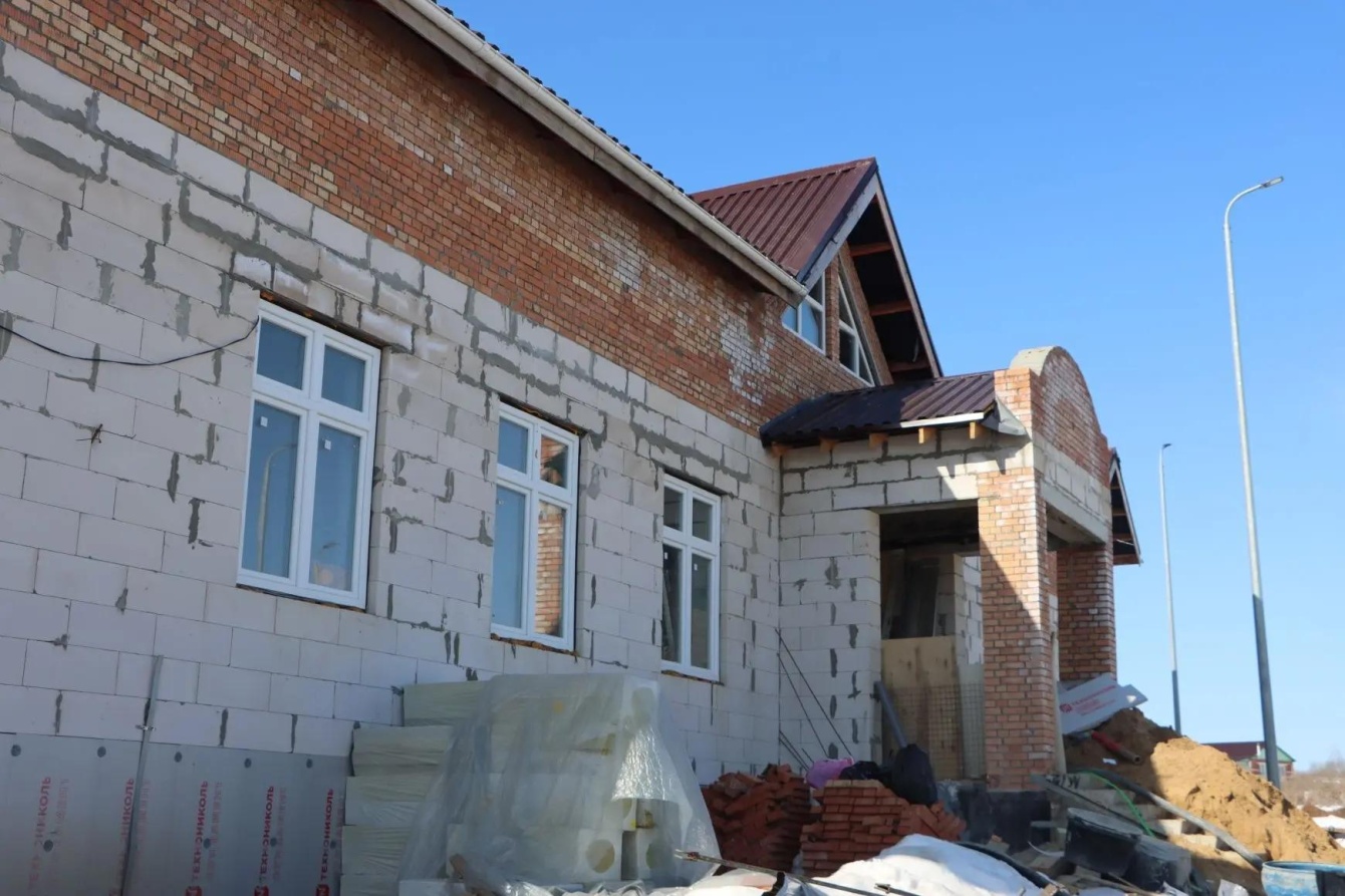Строители уже завершили устройство фундамента, возведение наружных и внутренних стен, монтаж стропильной системы крыши. Также выполнены работы по заливке черновых полов и армопояса, установлены плиты перекрытий и окна. Часть стен уже оштукатурена. Кроме того, проложены наружные сети водоснабжения и водоотведения, а также установлены фундаменты для опор уличного освещения. Заказчик уже приобрел необходимое оборудование, которое будет установлено позднее.