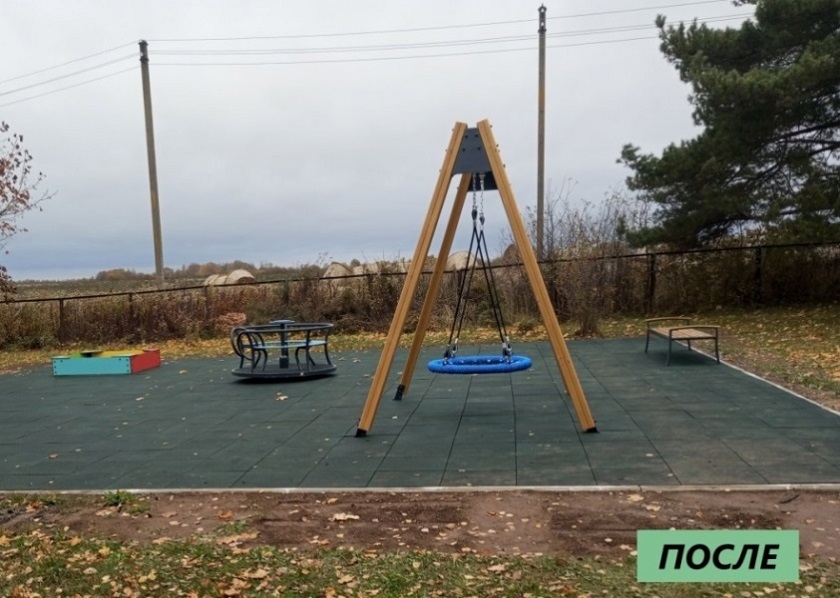 В рамках благоустройства были выполнены работы по установке качелей, карусели, песочницы и скамейки, а также по устройству резинового покрытия.
