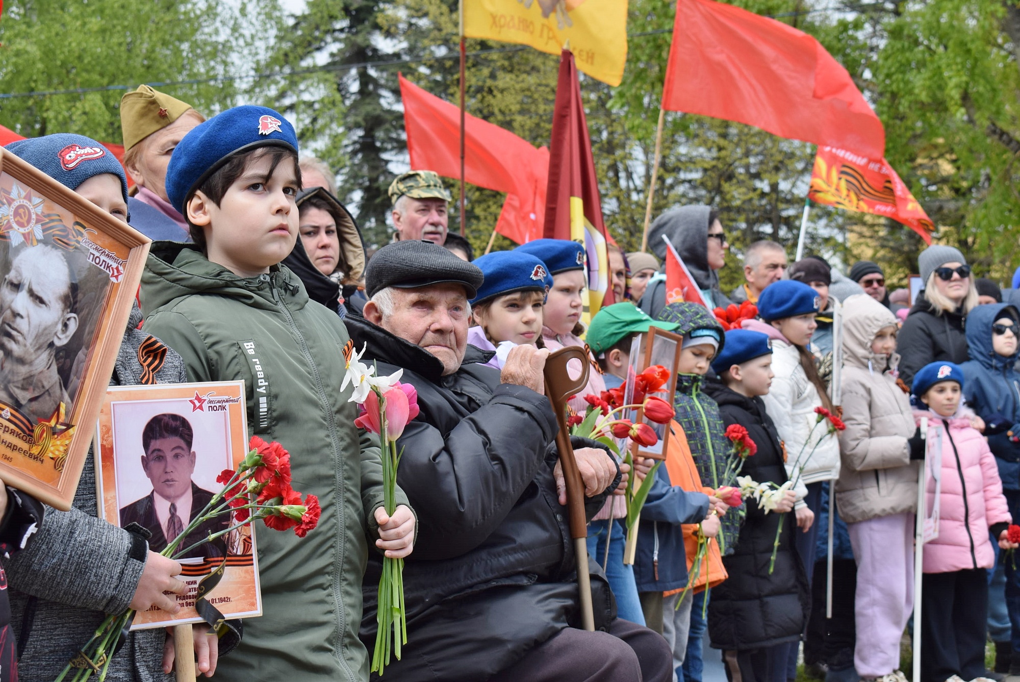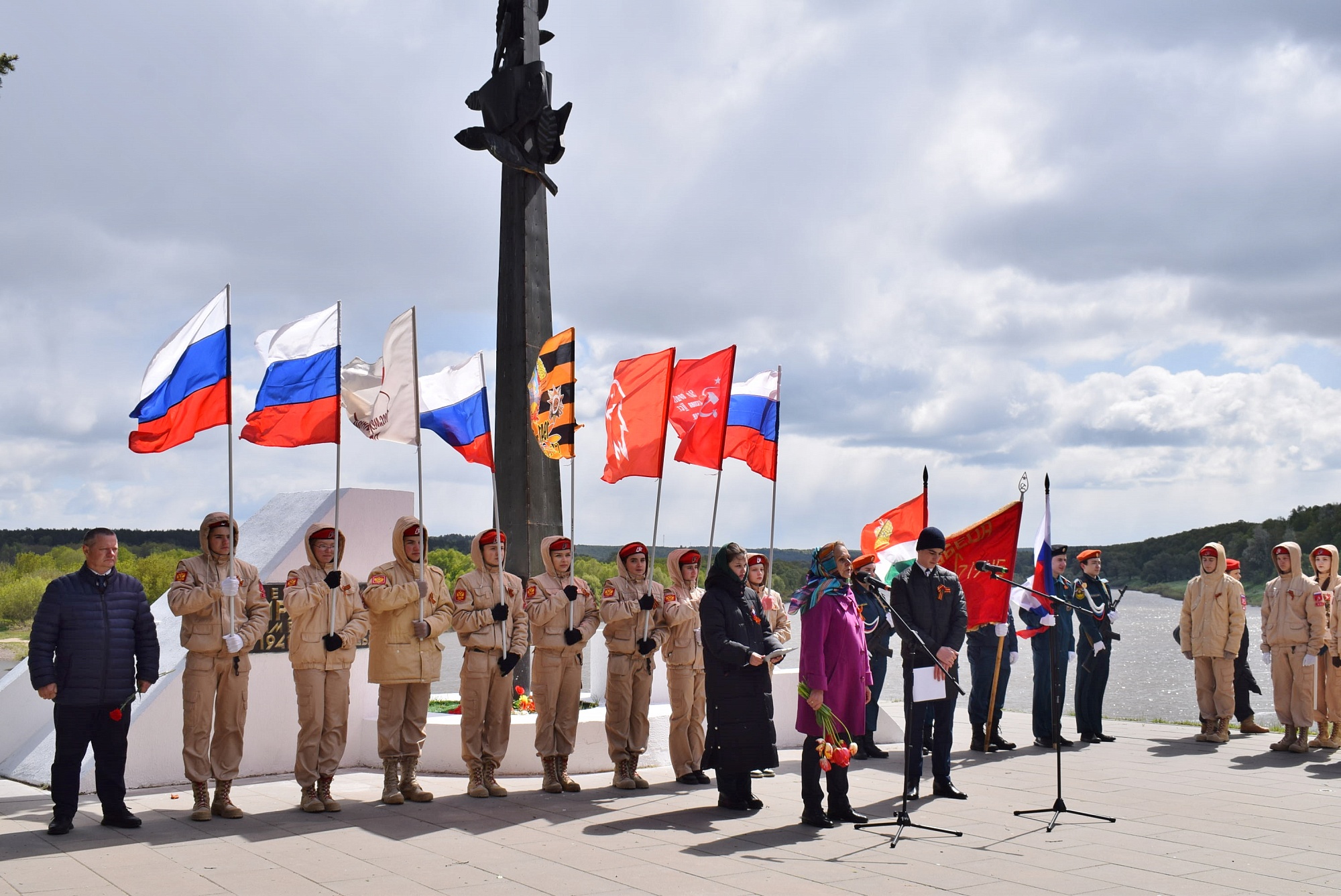 Празднование Дня Победы началось на высоком берегу Оки у стелы воинам-тарусянам. Сюда, на площадку у мемориала павшим героям, под звуки победных маршей с флагами и знамёнами вышел торжественный парад. Открыли его отряд юнармейцев имени Героя России М. Г. Ефремова и ученики и учителя школы № 2 имени учёного В. З. Власова.