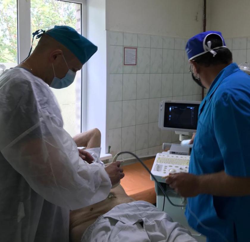 Они произвели осмотр больных диспансерной группы, дали рекомендации по коррекции лечения, а при необходимости – направляли на стационарное лечение в область. Врач-уролог областной больницы Илья Верещагин и заведующий хирургическим отделением Тарусской ЦРБ Владимир Савосин провели короткую операцию экстренному больному: они сделали пациенту троакарную цистостомию (на снимке).