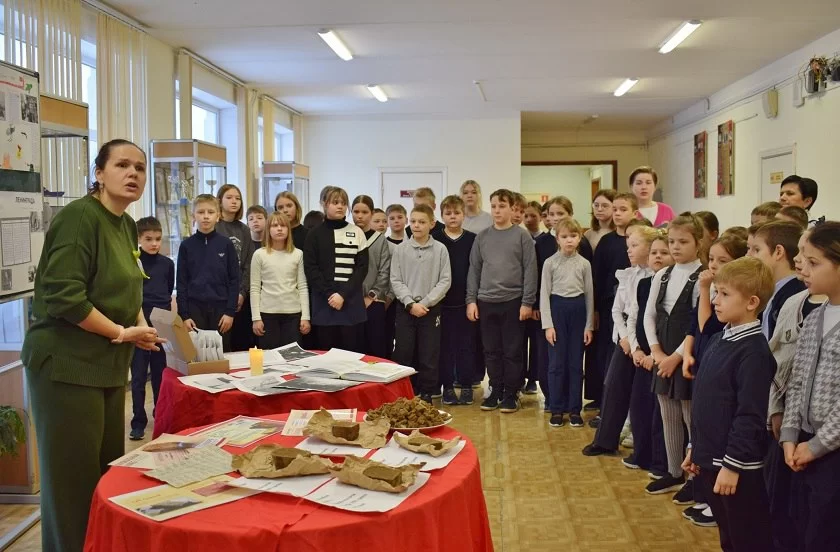 Дети ещё раз услышали историю великого подвига и силы духа ленинградцев. Попробовали на вкус блокадный хлеб, состоящий в то время из обойной муки, жмыха, солода и всего, что пригодно для еды. Хлеб, по рецепту близкий к ленинградскому, специально к памятной дате каждый год печёт тарусянка Нина Викол. Увидели, как постепенно уменьшалась норма его выдачи.