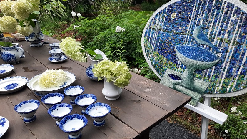 Тарусские художники вместе со студентами создали художественные столешницы и декоративное панно из осколков гжельской посуды. Это ещё один принцип Сада Ракицкого — здесь популяризируют вторичное использование материалов и бережное отношение к природе.