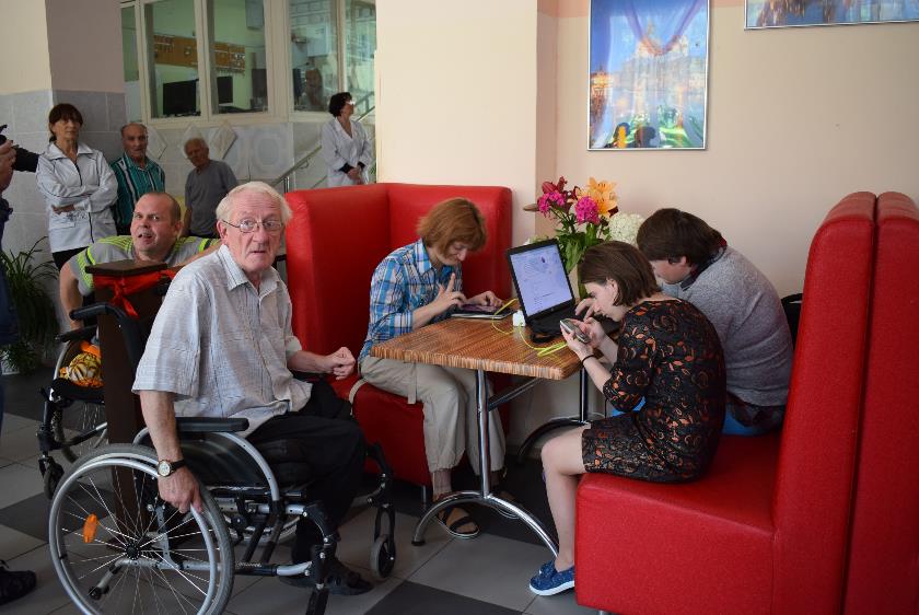 Новое интернет-пространство с зоной свободного WI-FI - это несколько уютных диванов и оборудованых столов, расположившихся в фойе дома-интерната. Организаторы также предусмотрели специальное место для людей с ограниченными возможностями здоровья, передвигающихся на колясках. Интернет был в учреждении и раньше, теперь же появилась возможность пользоваться сетью, не привязываясь к точке доступа на втором этаже. Этому обстоятельству проживающие, а многие из них - люди молодые, очень рады.