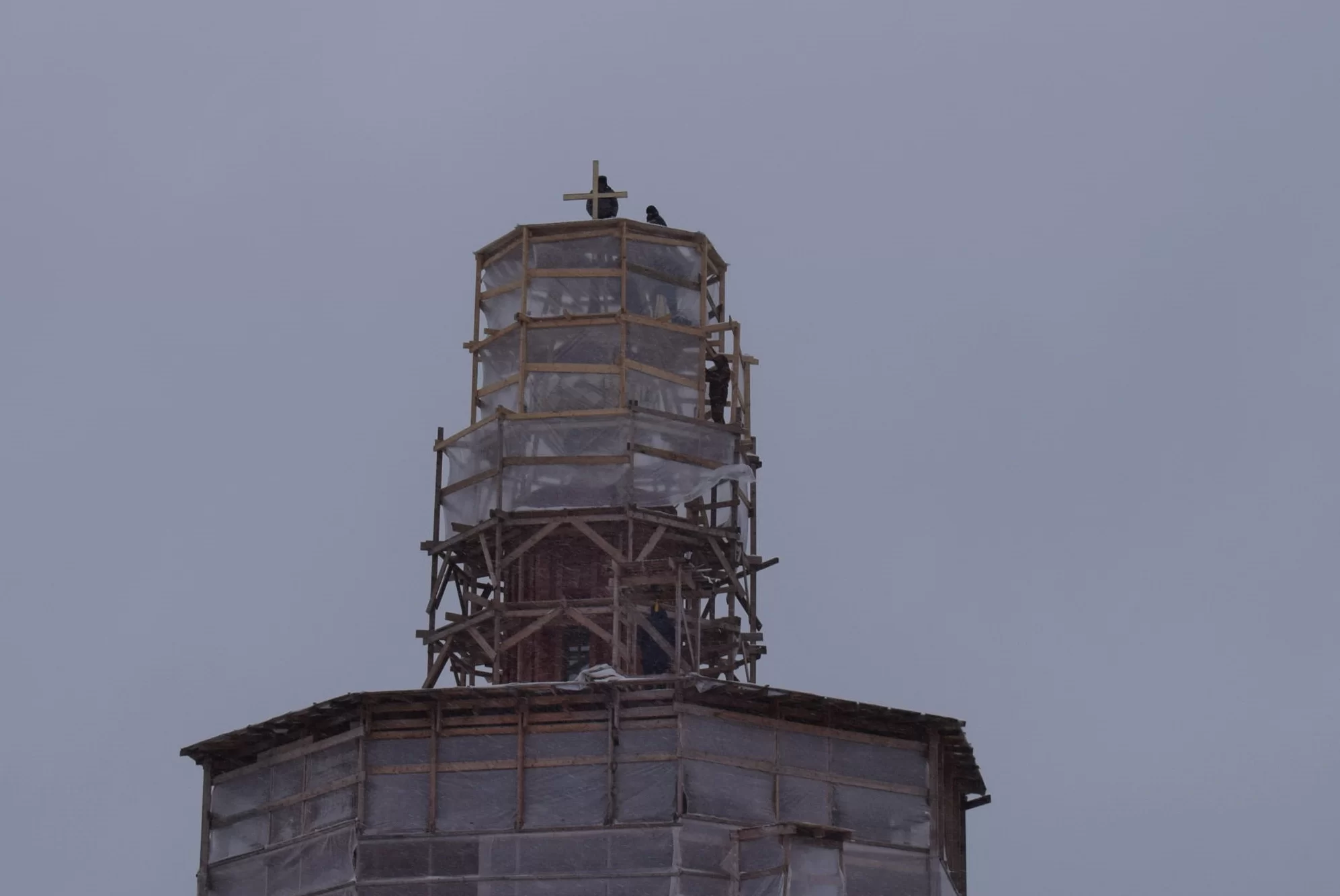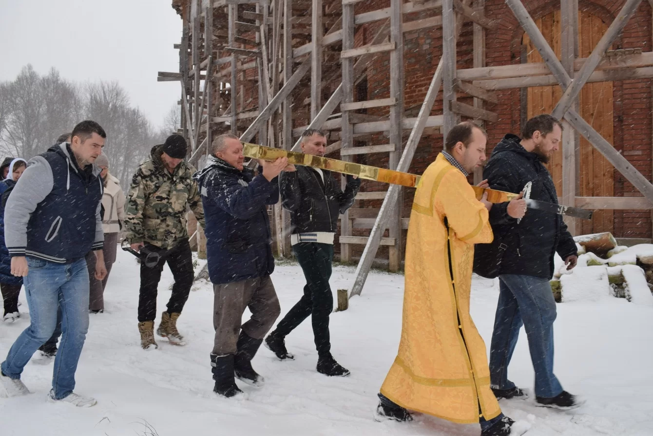 После крестного хода рабочие подняли крест на высоту порядка 40 метров. Когда снимут строительные леса, его будет хорошо видно издалека.