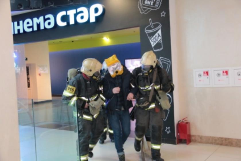 Несмотря на то, что пожар был условным, спасатели совместно с сотрудниками торгового центра эвакуировали из здания посетителей и зрителей из зоны кинотеатра.