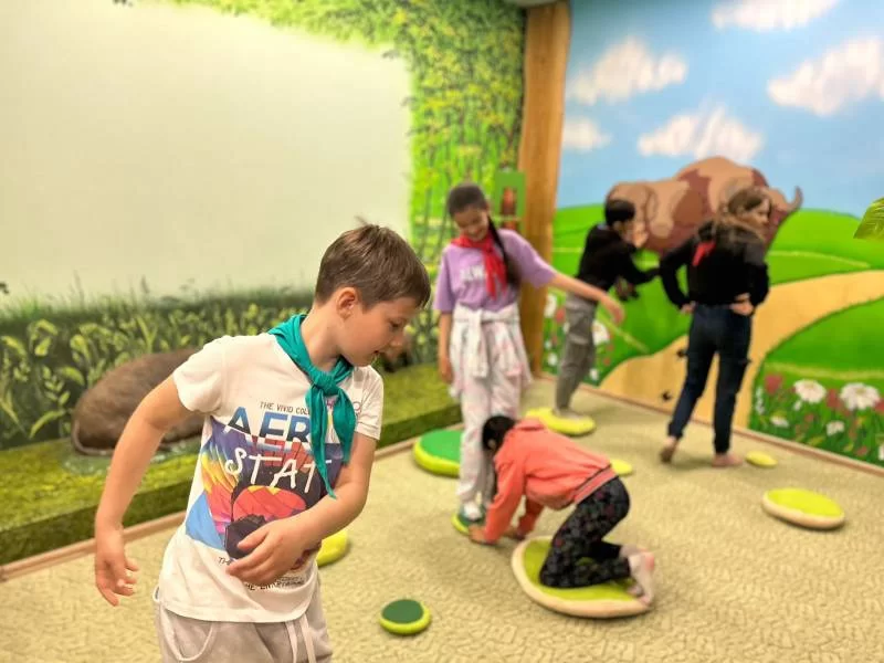 Чтобы юные экскурсанты не заскучали, в визит-центре для них предусмотрены интерактивные элементы. С помощью них ребята и даже взрослые могут послушать голоса птиц, ознакомиться с археологическими находками и следами животных. Также дети могут попрыгать по имитированным болотным кочкам.