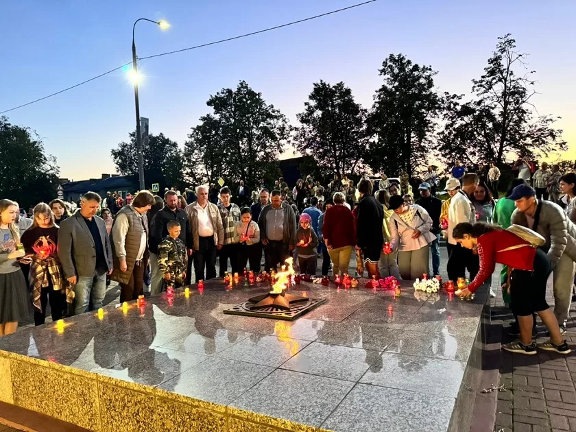 Звучали стихи и песни о войне, на большом экране шли кадры военной кинохроники. В конце мероприятия собравшиеся поставили десятки зажжённых свечей к вечному огню и памятным плитам.