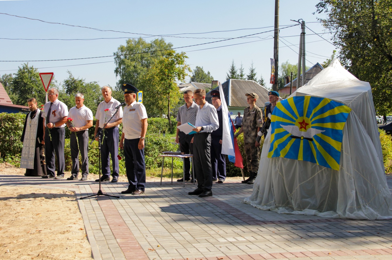 Почетное право открыть памятный знак воинам-авиаторам было предоставлено Максиму Мартынову, Евгению Яшечкину, Марату Санаеву, Анатолию Исаченко. Звучит торжественная музыка, с памятного знака снимается парашют.