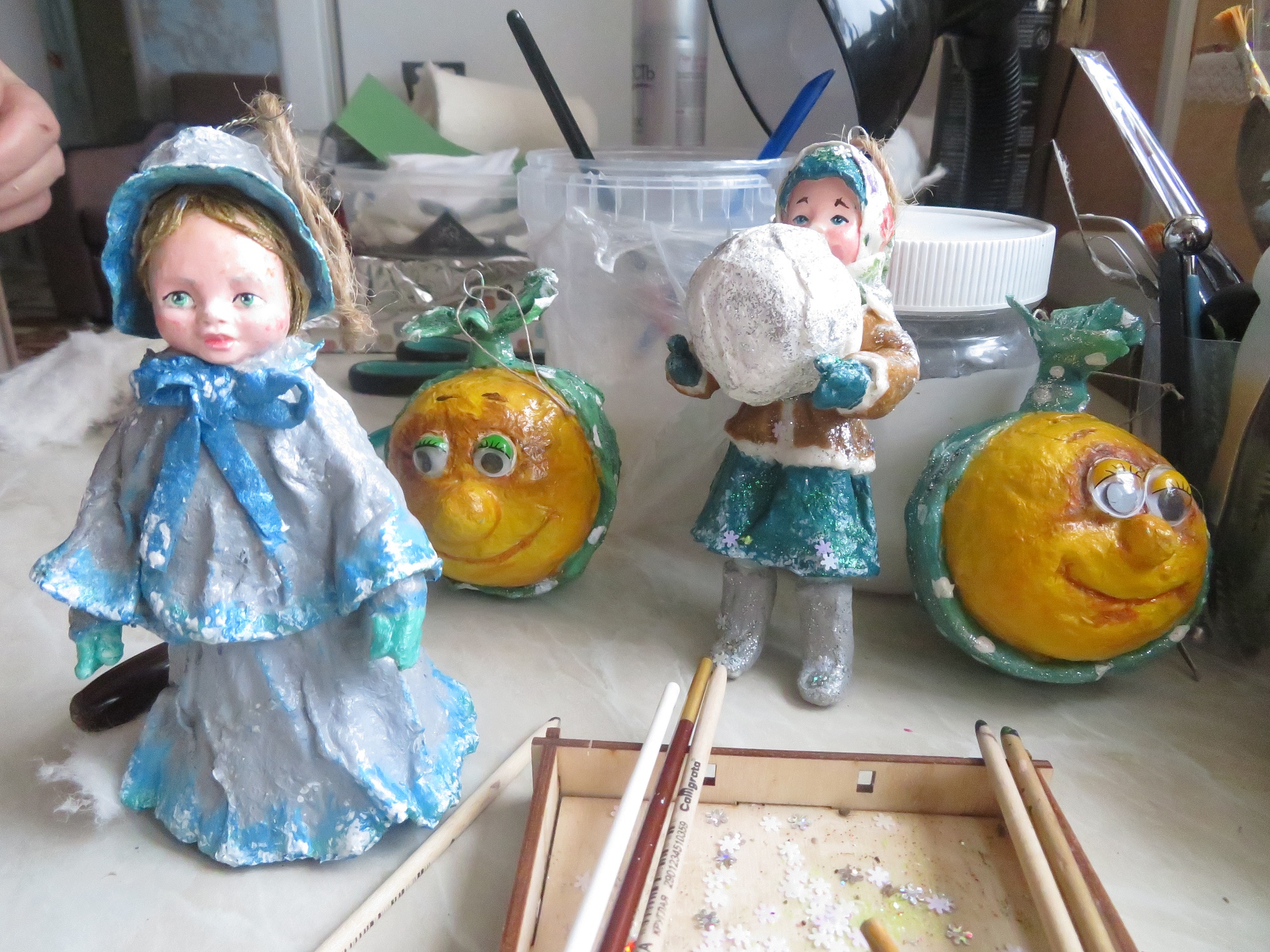 Почти вся мастерская рукодельницы умещается на широком кухонном подоконнике. Чего здесь только нет: кисти разной толщины для прорисовки черт лица и нанесения клейстера, разноцветные краски, мастихины, стеки для лепки и множество других необходимых для работы инструментов.Изготовление ватной игрушки – процесс долгий и кропотливый. Сначала необходимо сделать каркас будущей игрушки из проволоки или бумажного конуса. Потом на заготовку наносится несколько слоев пропитанной клеем ваты (мастерица использует медицинскую). И каждый слой надо просушить.