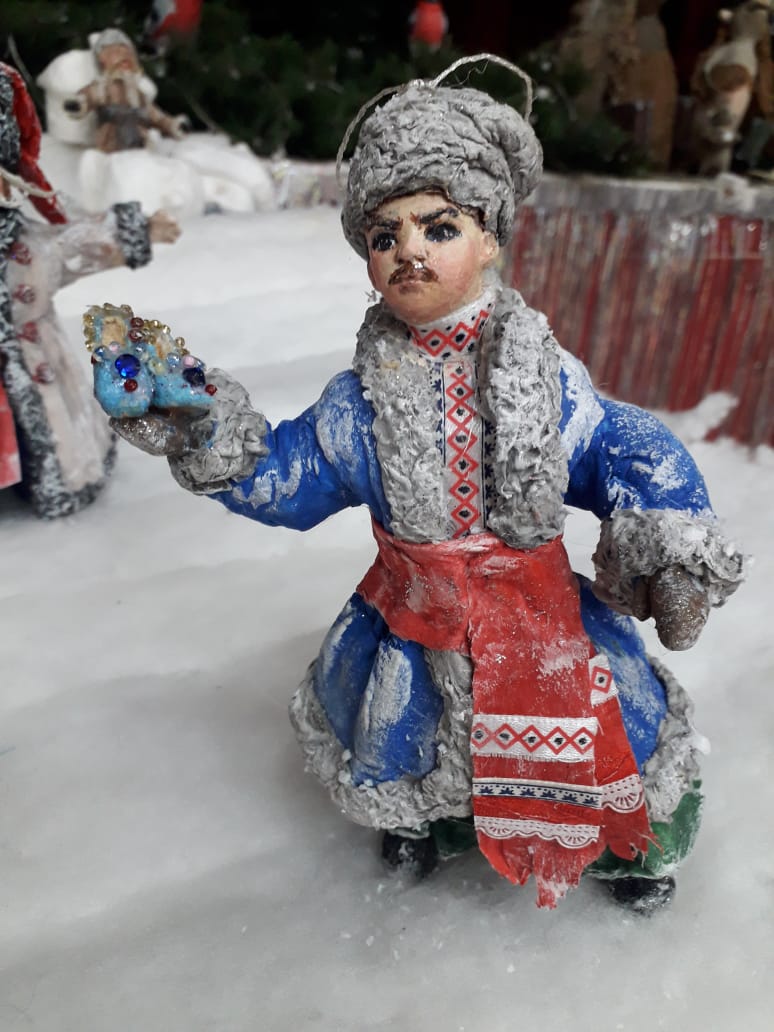 За каждой куклой – своя история. Вот кукольный портрет внучки Олимпии, который бабушка подарила девочке на день рождения. А еще есть элегантная дама с собачкой, правда, не чеховская. Притягивают к себе и образы из «Вечеров на хуторе близ Диканьки» Гоголя – кузнец Вакула, красавица Оксана, колоритная ведьма Солоха, казак Чуб, который получился, кстати, очень характерным.