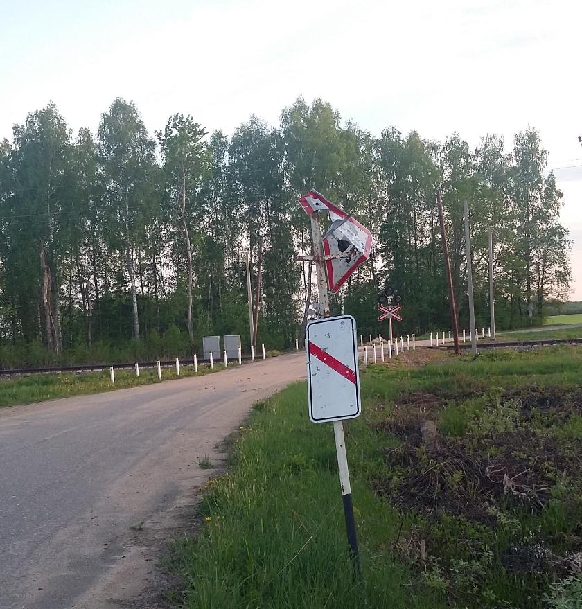 Ежедневно мне приходится проезжать железнодорожный переезд возле деревни Шемелинки. В середине апреля обратила внимание на дорожный знак, который предупреждает, что через 50 метров - железнодорожный переезд. Подразумевается, что на данном участке потребуется проявить особое внимание и осторожность. Так вот, этот знак полностью прострелен, а фактически - уничтожен.