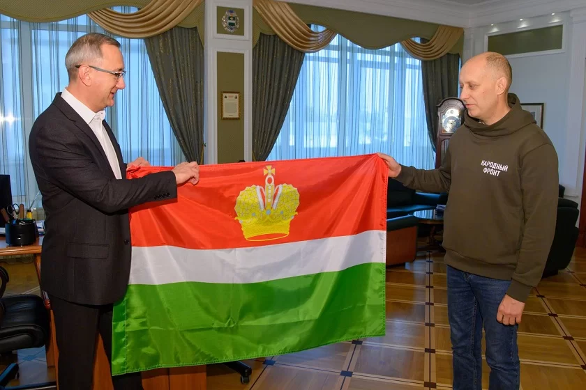 Глава региона торжественно передал депутату флаг нашей области, как символ славных традиций калужской земли.