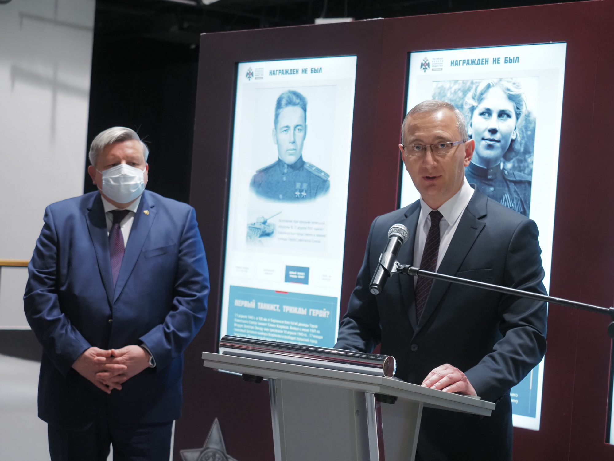 Губернатор рассказывает, что сегодня он совместно с заместителем председателя Российского военно-исторического общества Николаем Овсиенко открыли эту мультимедийную выставку, которая называется «Война. Герои и подвиги».