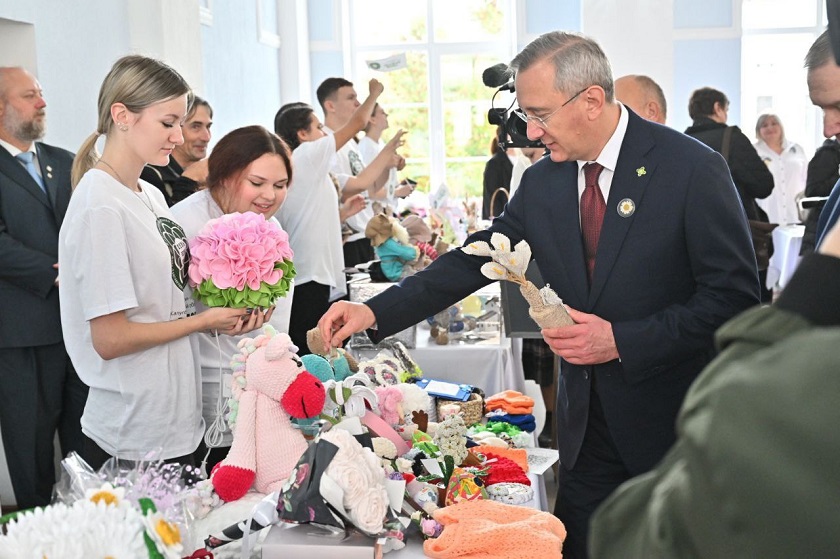 В Танеевском зале работала выставка калужских талантливых мастеров и детей, где глава региона приобрел несколько сувениров. Средства от продажи выставочных работ пойдут на лечение калужских детей.