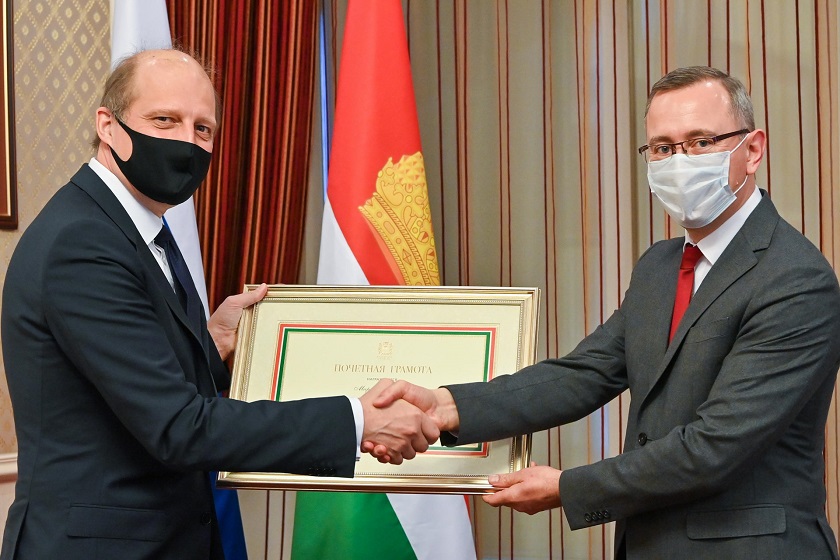 Глава региона сообщил, что господин Озегович переходит на другую работу. Поэтому он в знак благодарности за личный вклад в развитие экономики региона вручил Маркусу Озеговичу Почетную грамоту губернатора Калужской области и пожелал ему успехов на новой должности.