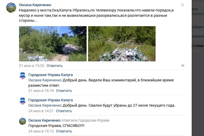 Так, калужанка написала в «Вконтакте» о мусоре, который вовремя не вывезли от моста через Оку. Это замечание взяла в работу городская управа Калуги и свалки были оперативно убраны силами подрядной организации.
