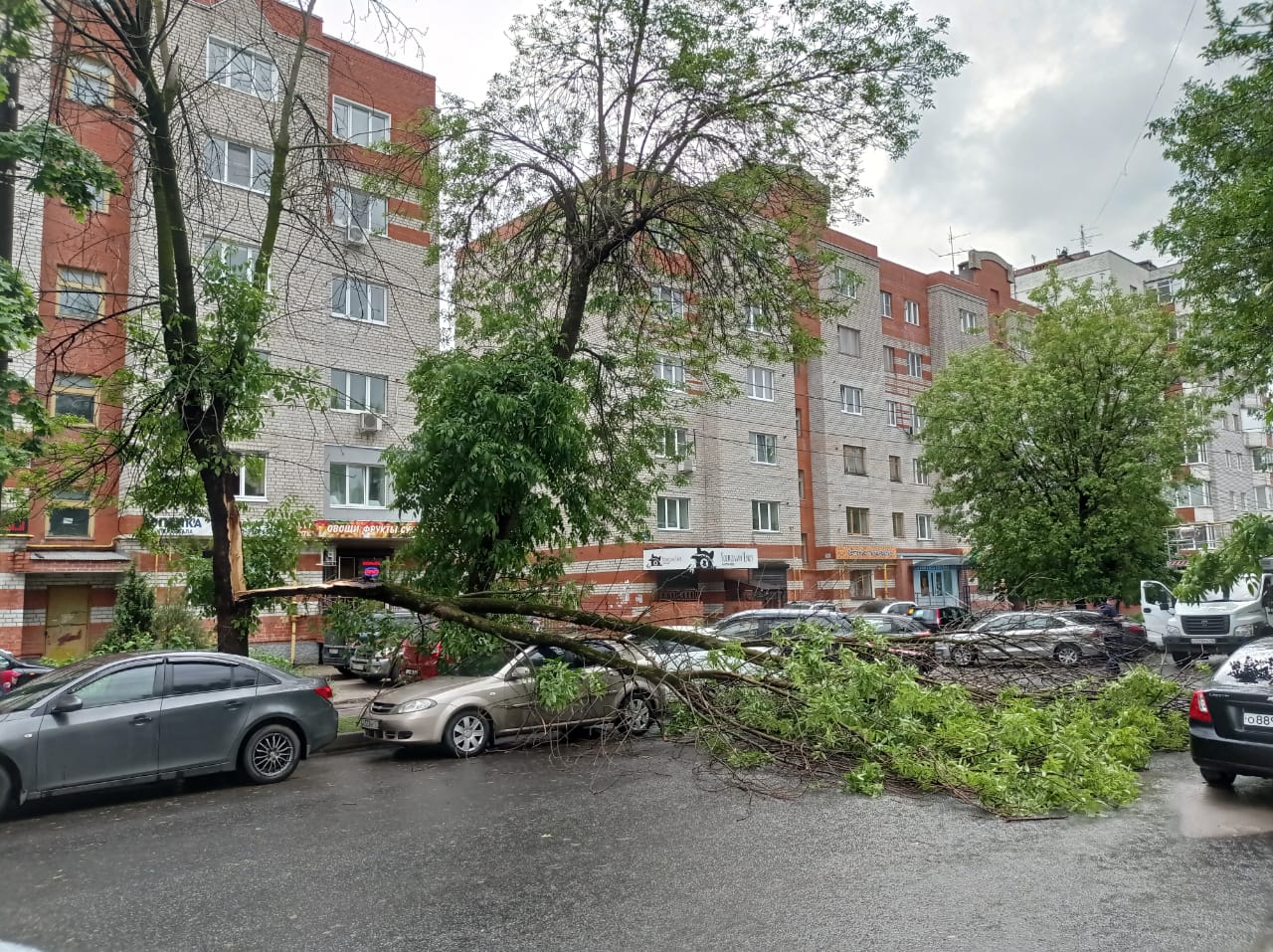 Улица в настоящее время полностью перекрыта упавшим деревом, городские коммунальщики начали распиливать свалившиеся сучья, чтобы убрать их с дороги и снять с машины.