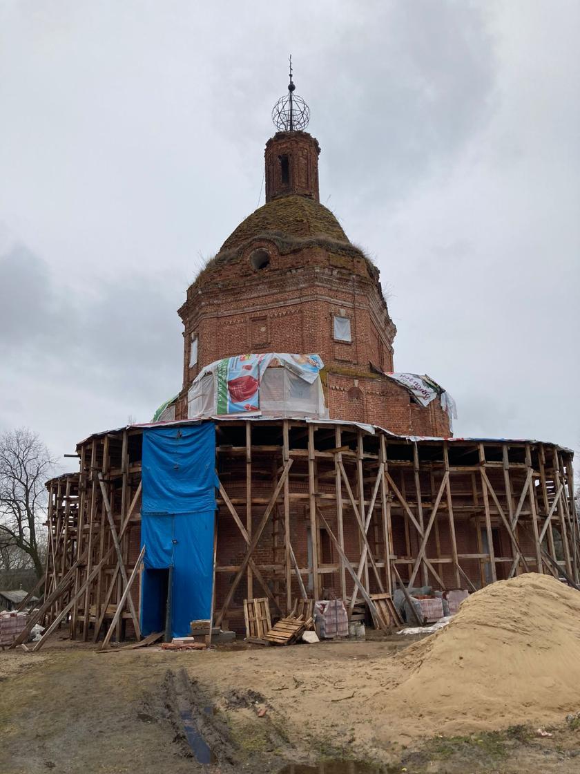В начале апреля здесь продолжились строительно-реставрационные работы. Первый этаж храма Вознесения одет в строительные леса: понемногу, метр за метром, строители произвели вычинку старинного кирпича. Сейчас они перешли внутрь для реставрации кирпичной кладки стены, что по левую сторону от алтаря. В основном приделе это один из самых проблемных участков, требующий укрепления.