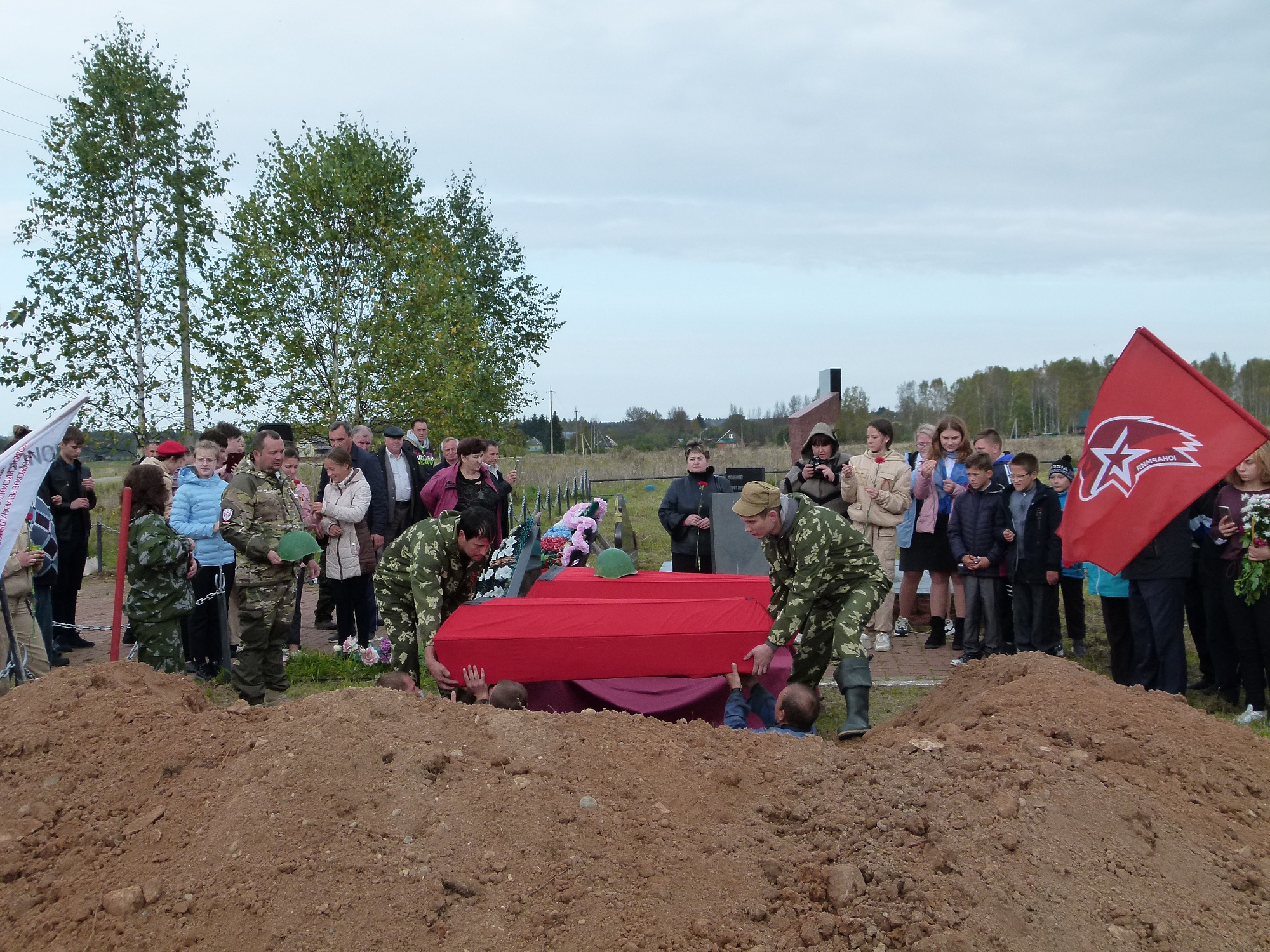 – Мы собрались здесь, чтобы отдать дань памяти тем, кто не вернулся с полей сражений Великой Отечественной войны, – обратился к собравшимся на траурном митинге у мемориала «Ивановское поле» глава района, депутат районного совета Петр МАРКЕЛОВ. – Нам не дает покоя эхо войны – взорванные доты, заросшие травой воронки и окопы. А главное – ненайденные, непогребенные безымянные солдаты, которые до сих пор остались на передовой. Сегодня мы отдаем последние почести еще одиннадцати погибшим в той войне, тем, кто значится в сводках без вести пропавшим. Особые слова благодарности всем участникам поискового отряда «Воря». Вы делаете огромную, тяжелую работу, взяв ответственность за ту часть исторической памяти, которая зовется долгом перед нашим героическим прошлым.В митинге также приняли участие заместитель главы администрации района Михаил Васильев, глава администрации сельского поселения «Деревня Ивановское» Вера Жаркова, председатель районного совета ветеранов Александр Филиппов, иерей Александр Немшилов, а также учащиеся Ивановской школы, члены военно-патриотического клуба и поискового объединения «Воря», юнармейцы отряда «Вымпел».