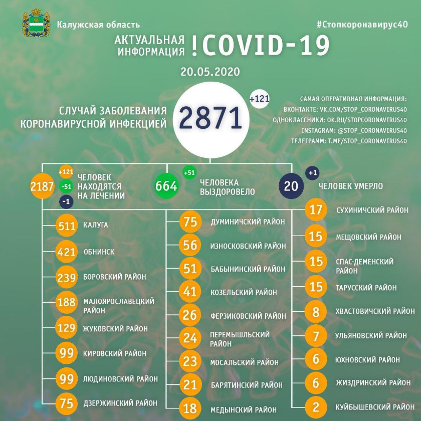 Актуальные на сегодняшнее утро данные опубликовал глава Калужской области Владислав Шапша. Он сообщил, что новая коронавирусная инфекция выявлена еще у 121 жителя области, общее число заразившихся составляет 2871. На лечении находятся 2187 человек. По-прежнему лидеры по числу инфицированных — областной центр и северная часть региона — Обнинск, Боровский, Малоярославецкий и Жуковский районы. За последние дни выросло число заболевших и в Кировском районе.