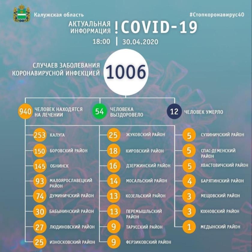 Больше половины выздоровевших их Калуги, Обнинска и Боровского района. Полностью здоровы после перенесенной инфекции еще 15 жителей Бабынинского, Думиничского, Козельского, Малоярославецкого, Дзержинского, Жуковского, Медынского, Сухиничского, Тарусского, Ульяновского, Ферзиковского районов.