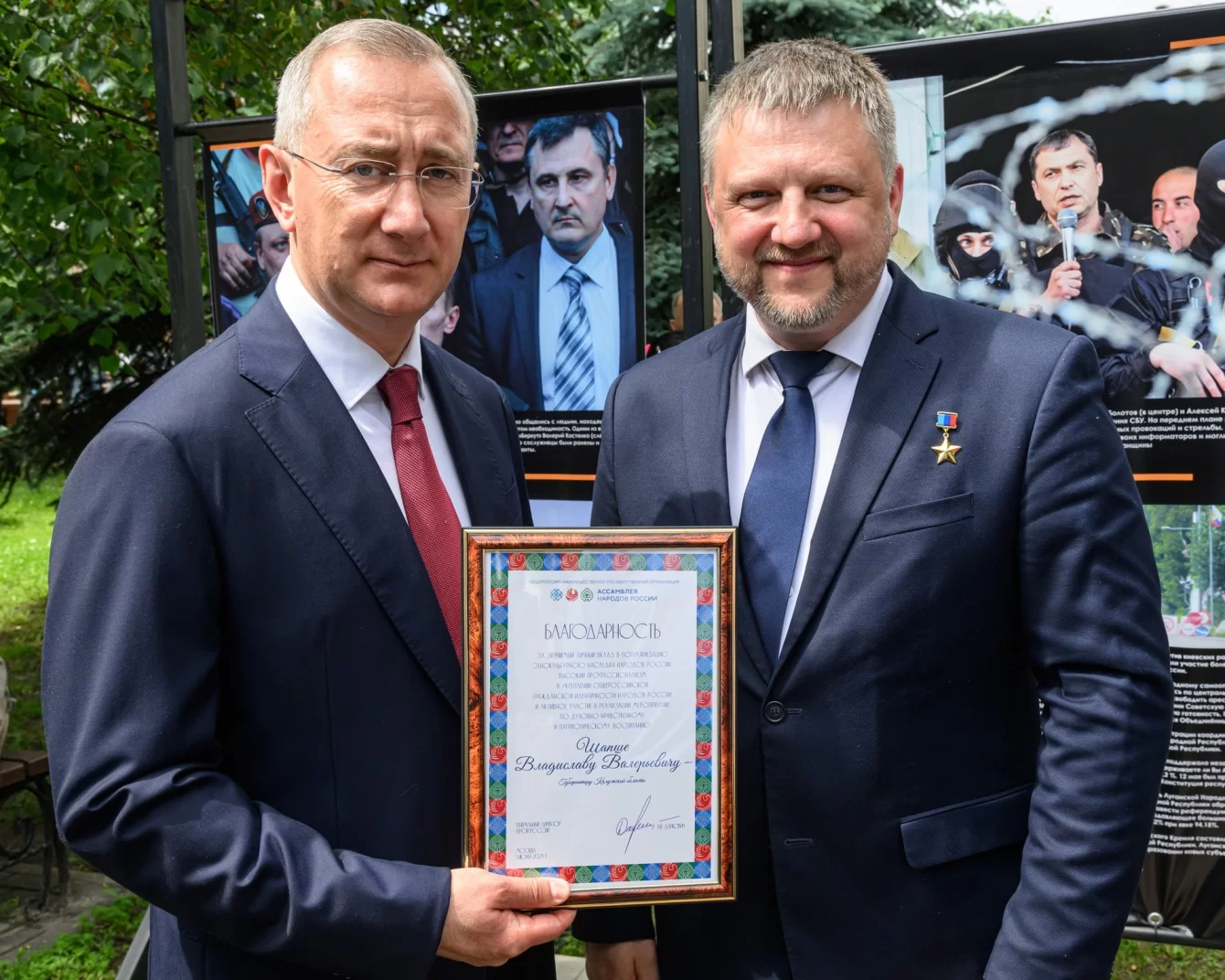 Она рассказывает о «Русской весне» и создании ЛНР, городе Первомайске, над которым шефствует наш регион. Калужанам и губернатору Владиславу Шапше выставку представил Герой ЛНР, председатель Общественной палаты ЛНР Алексей Карякин. Он передал Владиславу Шапше Благодарность генерального директора Общероссийской общественно-государственной организации «Ассамблея народов России», Героя России Александра Дарковича за значимый личный вклад в популяризацию этнокультурного наследия России и активное участие в реализации мероприятий по духовно-нравственному и патриотическому воспитанию.