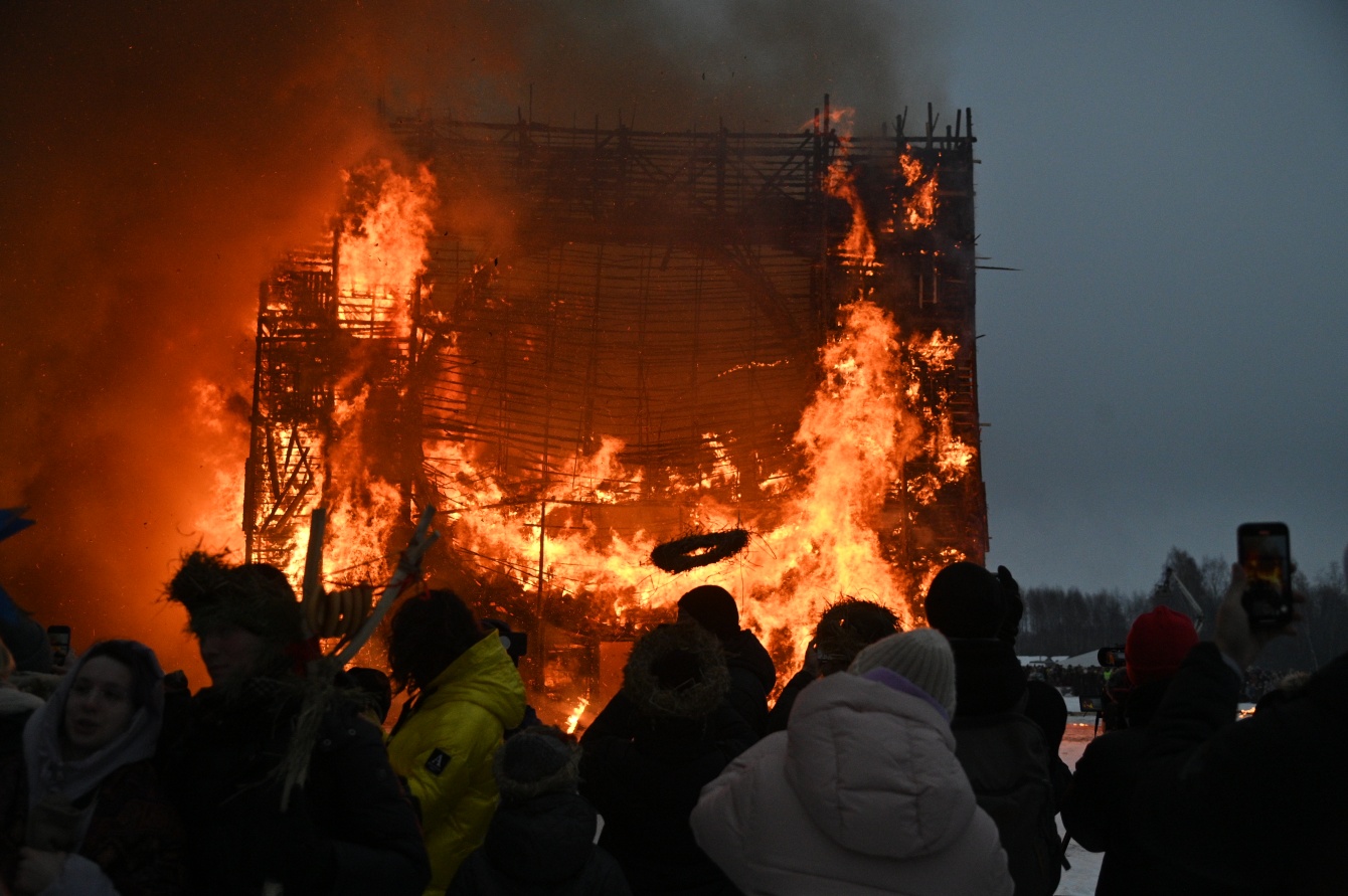 Интерес к Никола-Ленивцу понятен - живописные места, необычные арт-объекты. Для создания праздничного настроения хватило бы и этого, но уже много лет кульминацией празднования Масленицы здесь стало сжигание специально построенного для этого грандиозного деревянного объекта. Для него, как правило, используются разные подручные средства – старые ветки, сено, деревянный строительный и бытовой мусор.