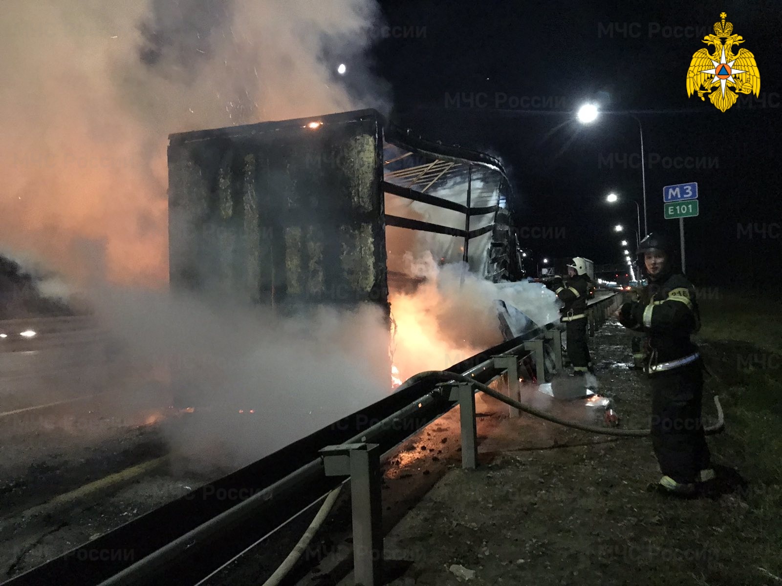 Первый пожар произошел около восьми часов вечера на 175 километре трассы М-3 «Украина» в Дзержинском районе. Восемь пожарный устраняли огонь в загоревшемся автомобиле. Судя по кадрам, это была фура.