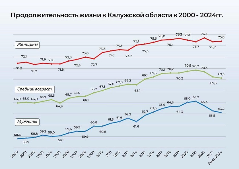 При этом, по данным регионального минздрава, ожидаемая продолжительность жизни с 2021 года выросла на 3,2 года – с 69,78 до 73,04 лет. С 2014 года минимальный показатель среднего возраста не падает ниже 68 лет. Кроме того, в 2023 году в Калужской области количество умерших сократилось на целых 4,2 процента.