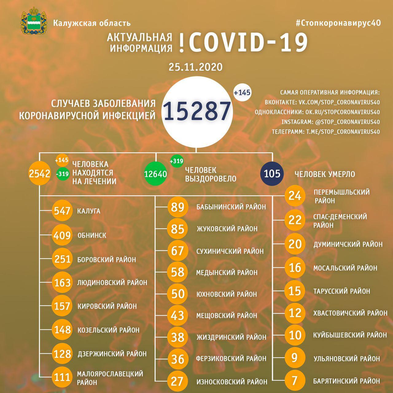 Общее число жителей Калужской области, справившихся с болезнью с начала пандемии, составляет 12640. На амбулаторном лечении и в больницах сейчас находятся 2542 пациента. С марта инфицирование ковидом официально подтверждено у 15287 калужан, из них 145 случаев выявлены за последние сутки. Об этом сообщает региональный оперативный штаб.