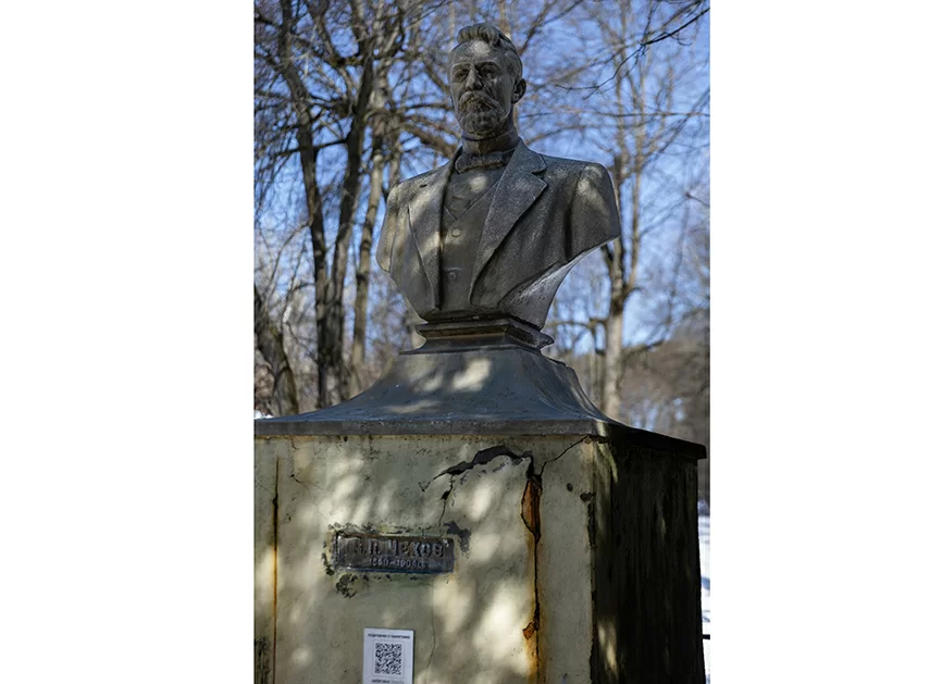 …В усадебном парке только начинал таять снег, и на нем можно было разглядеть следы людей, обходивших большой дом. К закрытым наглухо дверям ведут ступени. Рядом стоят пеньки, на которых можно посидеть и, может быть, окинуть мысленным взором, выражаясь чеховской строкой, «всю тоску медленно текущей жизни».