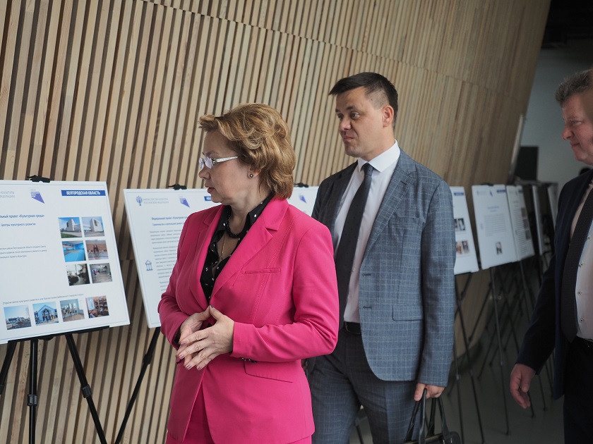 Ольга Ярилова с участниками совещания осмотрели в фойе ИКЦ выставку, посвященную реализации национального проекта «Культура» в субъектах Центрального федерального округа Российской Федерации.