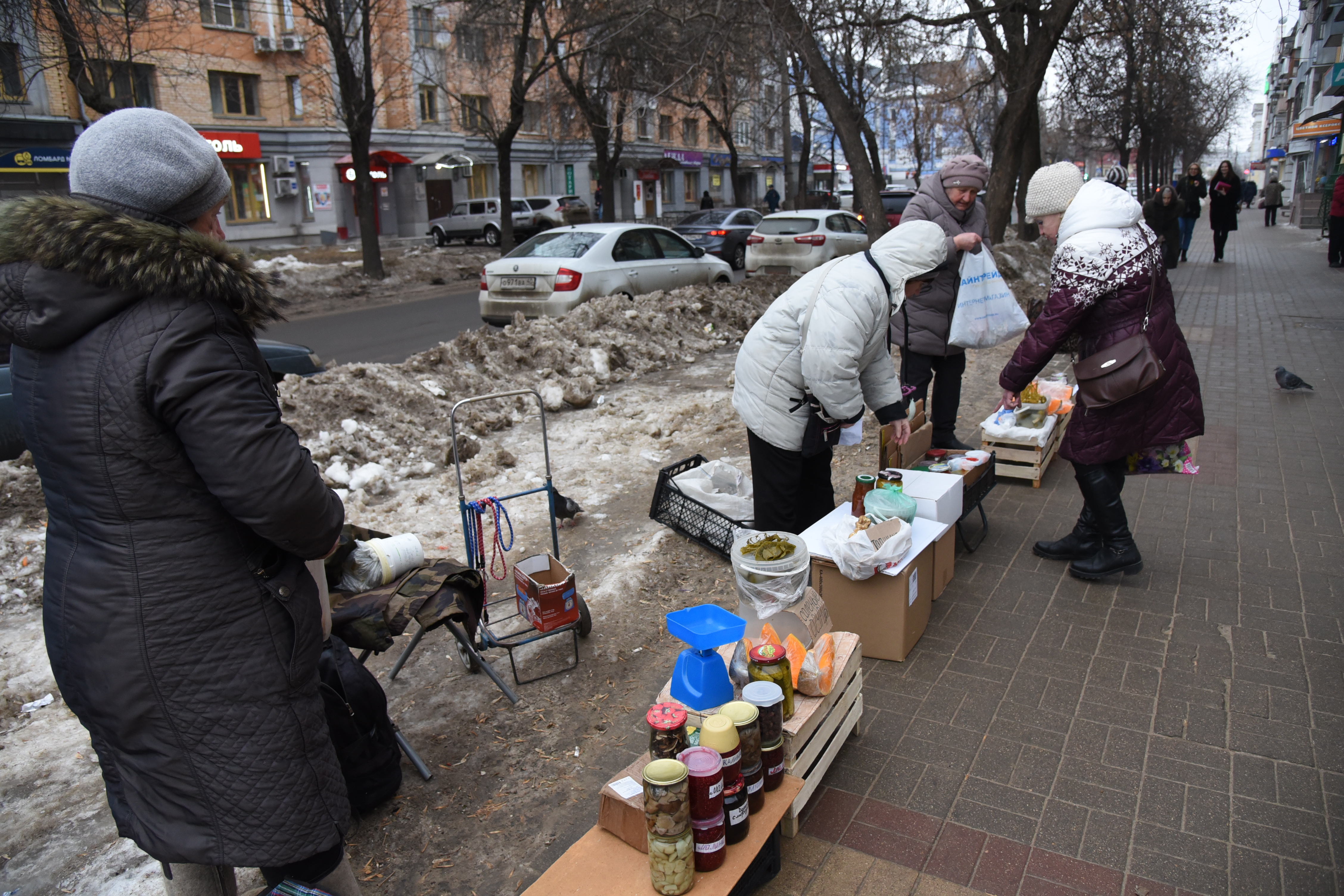 С недавнего времени на улице Плеханова образовался стихийный рынок. Стоят калужане со своим незамысловатым товаром и предлагают прохожим баночку огурцов, варенья, приправы, корни хрена, чеснок, картошку, яблоки.