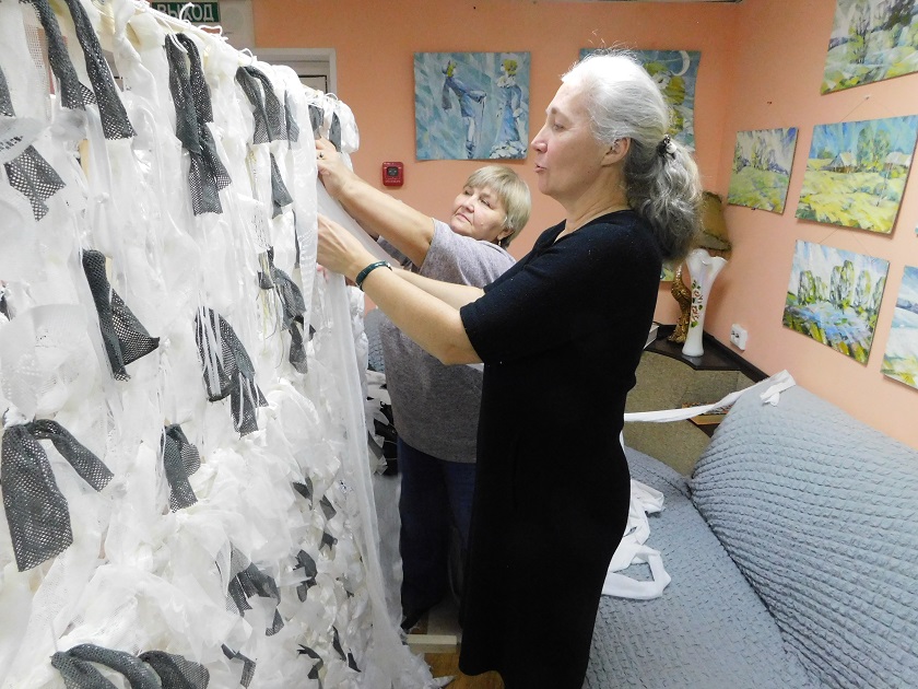 Как рассказала сотрудник волонтерского центра «Звезда» Светлана Клокова, капроновые основы маскировочных сетей привезли волонтеры из калужского православного центра «Фавор». Крупноячеистые полотна мастерицы разрезают на куски нужного размера, обметывают края, прикрепляют шнуры фиксации, а на ячейки в определенном порядке навязывают лоскутки. В ход идет старый тюль, шторы и другие тканевые вещи подходящей расцветки.