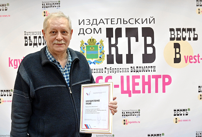 Благодарственное письмо и ценный подарок Игорю Фадееву вручил руководитель Калужского регионального исполкома ОНФ, депутат Законодательного Собрания области Дмитрий Афанасьев. Также в этот день награждены сотрудники информационного агентства «Калуга сегодня».